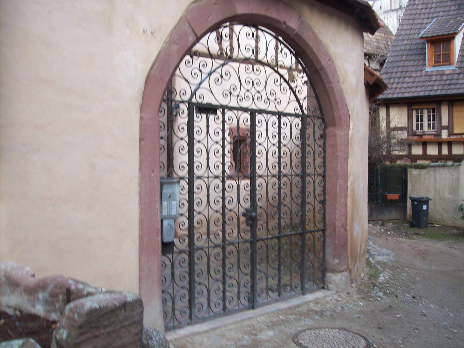 Ferme l'accès aux passagers tout en gardant l'aspect d'ouverture visuelle de la couleur intérieure et des bâtiments à colombages, tel fut la devis du client. Nous avons opté pour cette porte d'une grille décorative patiné à l'ancienne avec volutes et colliers sertis. Ajustage du cadre selon arrondi de la pierre, avec portes à deux battants et gâches électriques.